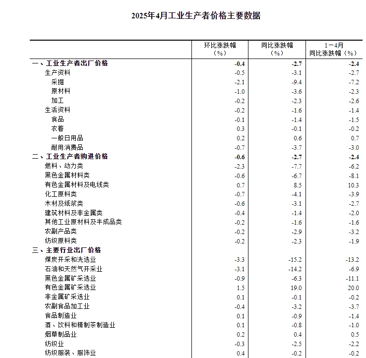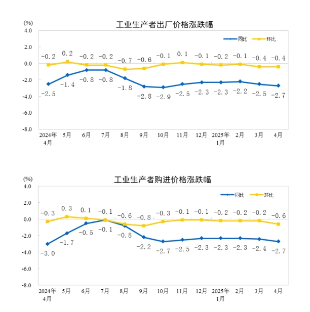 2025年4月份,全国工业生产者出厂价格同比下降2.7%,环比下降0.4%;工业生产者购进价格同比下降2.7%,环比下降0.6%。1—4月平均,工业生产者出厂价格和购进价格比上年同期均下降2.4%。