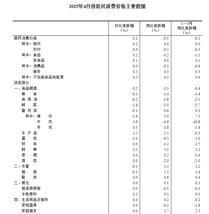 2025年4月份,全国居民消费价格同比下降0.1%。其中,城市持平,农村下降0.3%;食品价格下降0.2%,非食品价格持平;消费品价格下降0.3%,服务价格上涨0.3%。1—4月平均,全国居民消费价格比上年同期下降0.1%。