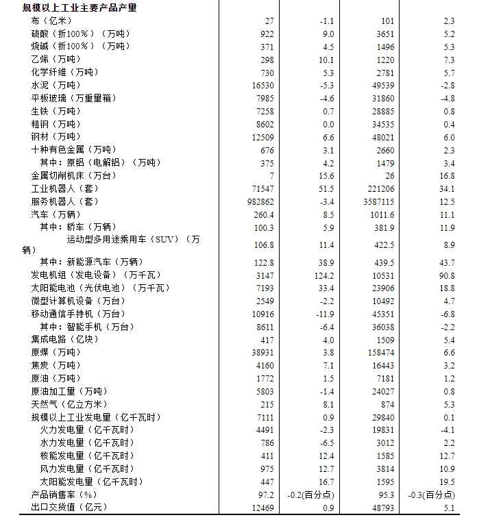 分产品看,4月份,规模以上工业623种产品中有341种产品产量同比增长。其中,钢材12509万吨,同比增长6.6%;水泥16530万吨,下降5.3%;十种有色金属676万吨,增长3.1%;乙烯298万吨,增长10.1%;汽车260.4万辆,增长8.5%,其中新能源汽车122.8万辆,增长38.9%;发电量7111亿千瓦时,增长0.9%;原油加工量5803万吨,下降1.4%。
