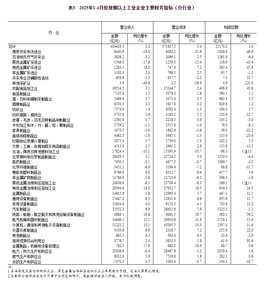 4月份,规模以上工业企业利润同比增长3.0%。