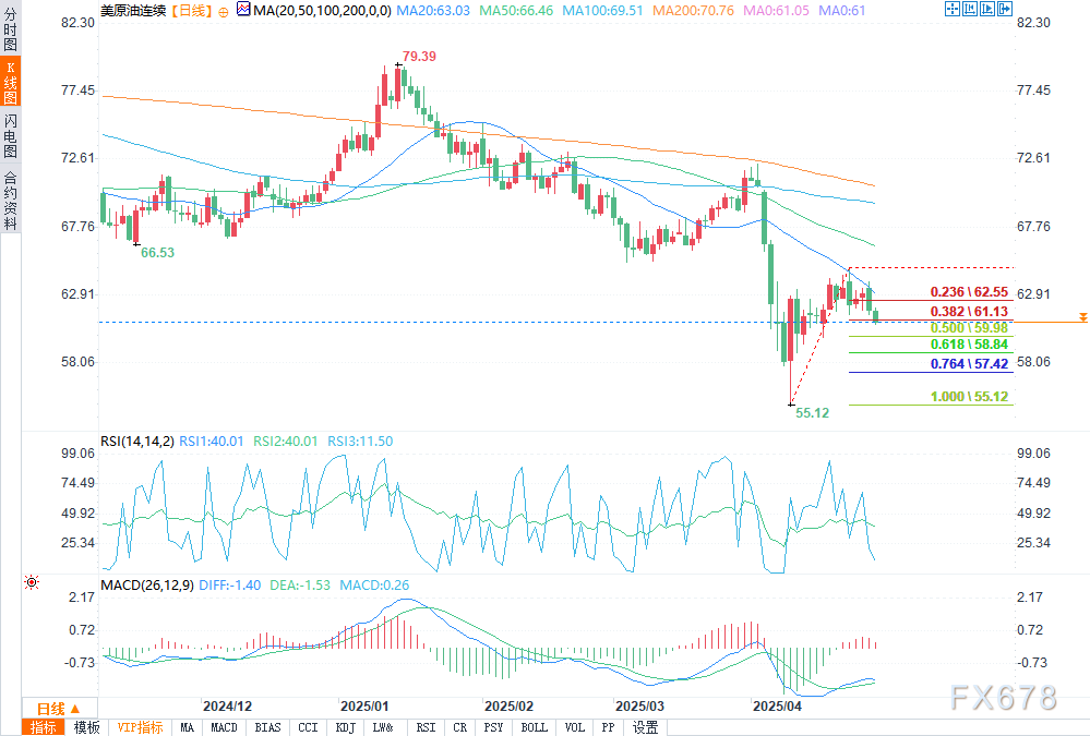 油价从四年低点55.12美元(4月9日的低点)反弹后,再次尝试上涨但均告失败,在72.27美元至55.12美元下跌波段的50%回撤位区域遭到反复打压,并跌破了55.12美元至64.85美元反弹波段的38.2%斐波那契回撤位(61.13美元)。