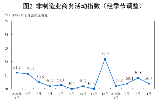 4月份,非制造业商务活动指数为50.4%,比上月下降0.4个百分点,仍高于临界点,非制造业继续保持扩张。
