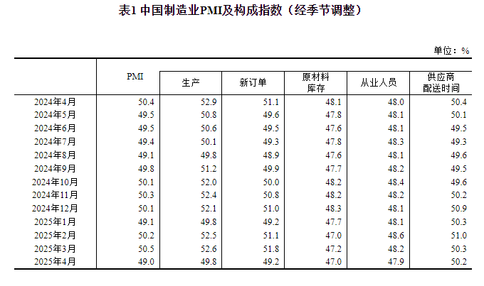 4月份,制造业采购经理指数为49.0%,比上月下降1.5个百分点;非制造业商务活动指数和综合PMI产出指数分别为50.4%和50.2%,继续保持在扩张区间。