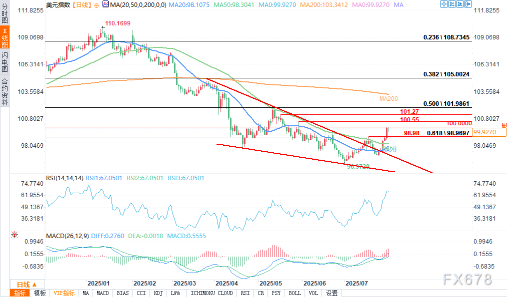 美联储鹰派立场引发市场震动 周三,美联储一如预期维持联邦基金利率在4.50%不变。鲍威尔在联邦公开市场委员会(FOMC)新闻发布会上保持谨慎,几乎未提供明确的前瞻性指引。他指出,通胀仍不平衡,劳动力市场指标仍在调整,并强调需更多时间评估特朗普政府关税政策的经济影响。 此番鹰派言论削弱了市场对9月降息的预期,根据芝商所FedWatch工具,9月降息概率从周二的65%降至46%,12月降息幅度预计为35个基点。 ING 银行外汇策略师 Guillermo Alcala 表示:“美元涨势符合我们此前的预测。强劲的 GDP 数据及美联储对政治压力的独立姿态进一步支撑美元,短期内涨势料将延续。” 经济数据好坏参半,劳动力市场韧犹存 周三公布的美国经济数据呈现好坏参半的局面。ADP非农就业变化数据显示,7月新增就业10.4万人,高于预期的7.7万人,显示劳动力市场在更广泛经济担忧下仍具韧性。初请失业金人数近期连续六周下降,为2022年8月以来最长连降期,进一步强化了市场对就业市场的信心。此外,第二季度GDP预览值意外升至3.0%,超出预期2.5%,反映经济增长势头强劲。 然而,GDP价格指数为2.0%,略低于预期的2.2%,暗示通胀压力有所缓解。住房市场则显现疲态,待完成房屋销售环比下降0.8%,逆转此前1.8%的增长。 招商银行金融市场部指出,尽管7月经济数据细节存疑,但整体表现稳健。若周五非农就业数据未加剧市场担忧,焦点或转向关税引发的通胀压力。 ING银行预测,12月或为美联储降息起点,但若就业和GDP增长疲软迹象加剧,降息幅度可能达50个基点。 关键数据前瞻:PCE与非农备受关注 市场今日聚焦核心PCE价格指数和就业成本指数,预计前者环比增长0.3%,后者环比上升0.8%。ING估算6月核心PCE月环比增长可能达0.46%,高于市场预期的0.3%,若数据超预期,可能进一步推高美元。 此外,初请失业金人数预计从21.7万小幅升至22.2万,为周五非农就业报告提供前瞻指引。 周五的非农就业数据备受瞩目,预计新增就业从14.7万降至10.6万,失业率从4.1%升至4.2%。平均时薪预计增长0.3%,可能影响通胀预期。ISM制造业PMI料为49.5,表明制造业持续萎缩,而密歇根大学消费者信心指数预计从61.8升至70.0,市场期待是否会出现上修。 美元在PCE数据公布前小幅回落,但整体看涨情绪未改。市场普遍预期整体通胀年率从2.3%升至2.5%,核心PCE料稳定在2.7%。分析人士警告,若通胀数据超预期,美联储可能继续保持鹰派立场,美元涨势有望延续。 技术分析 美元指数盘中接近100的新高点,这给多头们提供了信心,接下来几天的时间尤为重要。