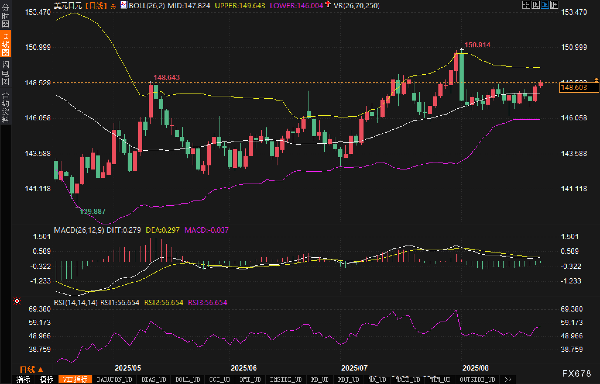 此前,7月的美联储政策会议决定维持4.25%-4.50%的利率区间,但两位美联储官员投票支持25个基点的降息。美联储的这番举动加剧了市场对9月降息的预期,而美国就业数据的疲软则进一步巩固了这一预期。美联储的官员们仍在等待更多的经济数据以确认降息的必要性。与此同时,美元的走势因市场对于鲍威尔讲话的预期而变得更加坚挺,市场对美联储是否会实施货币政策调整保持高度关注。 技术面 美元/日元汇价在近期内呈现加速上涨的趋势。当前汇价已接近148.80,并靠近布林带上轨(149.64),显示出市场的突破行为。布林带的收窄暗示价格波动的收窄,可能预示着未来的一波突破。