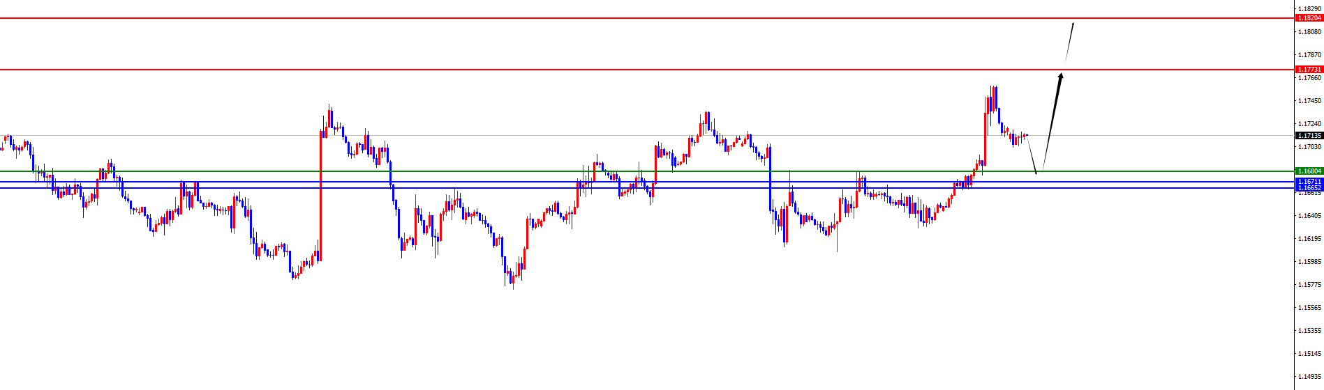 美指97.90-98区间空,防守5美金,目标97.30-96.90 欧美 欧美方面,上周五欧美价格总体呈现上涨的状态。当日价格最低下跌至1.1644位置,最高上涨至1.1759位置,收盘于1.1720位置。回顾上周五欧美市场表现,早盘价格直接获得支撑进一步上涨,从位置上看受撑于四小时支撑位置,非农数据公布后价格再度飙升,日线及周线均大阳收尾。 从多周期分析,从月线级别来看,欧美受撑于1.1060位置,所以价格在此位置之上长线多头对待。从周线级别看价格受撑于1.1670区域的支撑,此位置是中线走势的多空分水岭,上周突破后则后续依托此区域中期看多。从日线级别,随着时间的推移目前日线阻力于1.1665位置,此位置作为波段走势的关键分水岭,价格在此位置之上波段多对待。同时按照四小时级别看,上周五早盘依托四小时支撑上涨,随着时间的推移目前四小时支撑于1.1680区域,后续价格在此位置之上看上涨延续。