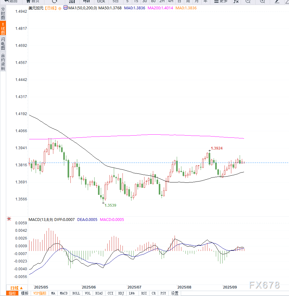 据市场调查显示,摩根士丹利与德意志银行预计美联储今年将共计降息三次,分别在9月、10月及12月各下调25个基点,以应对通胀压力减弱。 此外,投资者还关注特朗普经济顾问Stephen Miran是否能在美联储政策会议前获任命为理事。参议院全体投票定于周一晚间进行确认,这可能对市场情绪产生一定影响。 加拿大方面,投资者将关注周二公布的CPI数据,以及周三的加拿大央行(BoC)政策会议。市场对BoC可能采取宽松政策的预期有所升温,原因包括8月份就业减少约65,500个岗位,失业率上升至7.1%。这些数据为加元短期走势提供支撑。 技术层面上来看,USD/CAD目前徘徊在1.3840附近,短期均线呈现温和下行趋势,显示美元承压。RSI指标回落至中性偏低水平,暗示空头略占优势。若跌破1.3820支撑,可能进一步回探1.3780及1.3750水平; 若反弹突破1.3900阻力,则可能重启上行走势,测试1.3950关口。整体来看,USD/CAD短线维持区间震荡,但下行压力略占优势。
