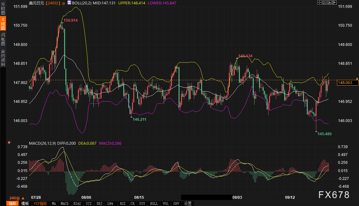 美日债市与汇率的交互影响 美债与日债的高相关性不仅影响各自收益率,还通过汇率传导至美元兑日元。日本机构若因日债收益率上升(1.64%)回流国内债券,可能减少美债需求,推高美债收益率(4.14%+),进而支撑美元强势。反之,美联储降息预期的深化可能限制美债收益率上行,缓解美元兑日元的上行压力。用户分析称,日本央行加息预期的升温可能在短期内压缩美元兑日元的上涨空间,但美日利差(4.10% vs 1.64%)仍支撑多头格局。 日本央行ETF减持计划与收益率曲线控制(YCC)的潜在调整是关键变量。若减持加速或YCC放松,日债收益率可能进一步上行,吸引资本回流,缓解日元贬值压力,但需警惕对美债市场的外溢效应。美债市场方面,20年期债券需求减弱(溢价降43个基点至35个基点),暗示市场对长期收益率的敏感性上升,可能加剧美元兑日元波动。 技术面:震荡中的突破临界 美元兑日元240分钟图表显示强势震荡格局。当前交投于布林带中轨147.131上方,逼近上轨148.415。MACD指标DIFF线(0.201)高于DEA线(0.067),金叉形态在零轴上方延续,表明多头动能占优。关键支撑位在147.131-147.500(布林带中轨与21日均线重叠),阻力位在148.415-149.134(布林带上轨与前高)。 汇价接近布林带上轨,MACD双线在高位运行,显示短线超买风险。若带量突破148.415并企稳149.134上方,可能上探150.00心理关口;若遇阻回落,147.131-147.500区间将提供支撑。季末资金流动可能加剧148.00-149.00区间波动,需关注突破方向。 未来趋势展望 未来一周,美元兑日元与美日债市的走势将在政策预期与市场情绪博弈中演进。美债10年期收益率预计在4.10%-4.20%区间震荡,美联储降息路径明朗化将限制上行空间,但“关税言论”可能推升避险情绪,支撑收益率企稳。10年期日债收益率受加息预期驱动,可能上探1.70%,但受低流动性与YCC干预限制,涨幅或放缓。美元兑日元在技术面支撑下有望测试149.134阻力,突破后可能挑战150.00;若遇阻回落,147.131-147.500区间将提供支撑。 市场需关注9月24日日本财务省与一级交易商会议、10月2-3日植田和男讲话及10月4日自民党领导选举结果,这些事件可能进一步影响日债与日元走势。美元兑日元的多头格局在政策分化与技术动能支撑下短期占优,但需警惕日本央行政策转向与季末资金流动带来的波动风险。