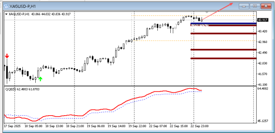 点击输入图片描述(最多30字) 其他技术点评: 目前QE箭头向上,代表多头强劲,预示行情向上的概率大,故而可以采取低多的策略,可以在15分钟寻找做多信号,第一支撑位置:3726。上方压力3770 注:以上为日内策略于实时更新,也可能因市场波动,导致关键位置的改变,令策略失效,上述内容仅供参考学习,不构成任何投资建议,投资有风险,入市需谨慎。 白银(日内) 大概率:于43.71(P点)之上看涨(穆迪枢轴线) 小概率:于43.71(P点)之下看跌(穆迪枢轴线)