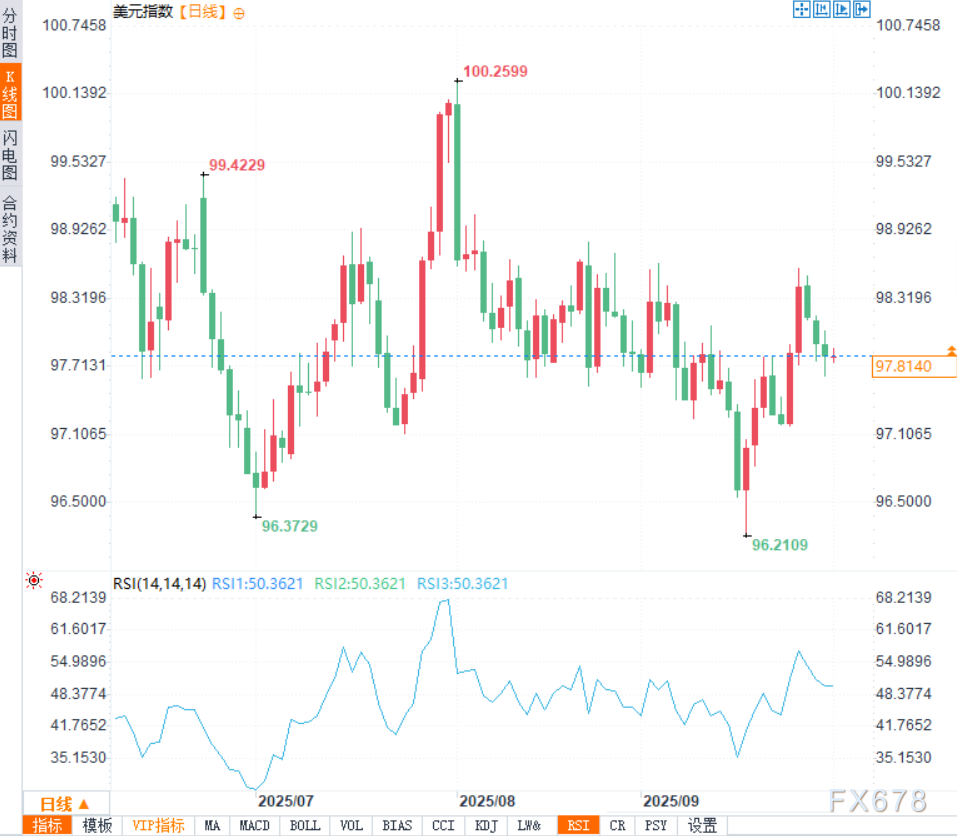 今年早些时候,就业差指数走低恰逢通胀预期攀升,这种组合曾是美联储决策者不愿看到的困境。但在周二(9月30日)这份沉闷的报告中闪现一丝曙光:通胀预期已开始降温。未来12个月通胀率的平均预期跌破6%,中位数预期更是降至5%以下。虽然两者仍远高于美联储2%的政策目标,但即便在疫情前低通胀环境中,这类预期也常徘徊于4%左右。 通胀预期回落正是FOMC推行后续降息所需的关键前提之一。最终,2026年降息周期与更具刺激性的财政政策形成合力,或将使消费者在明年伊始获得更坚实的基本面支撑。 美元短期将陷入多空拉锯 若就业差指数持续恶化,叠加通胀如期回落,美联储降息预期将主导市场,美元指数可能下探97.50支撑。 但硬数据韧性与通胀绝对值高企将构筑缓冲带,使美元呈现阶梯式下跌而非单边下行。