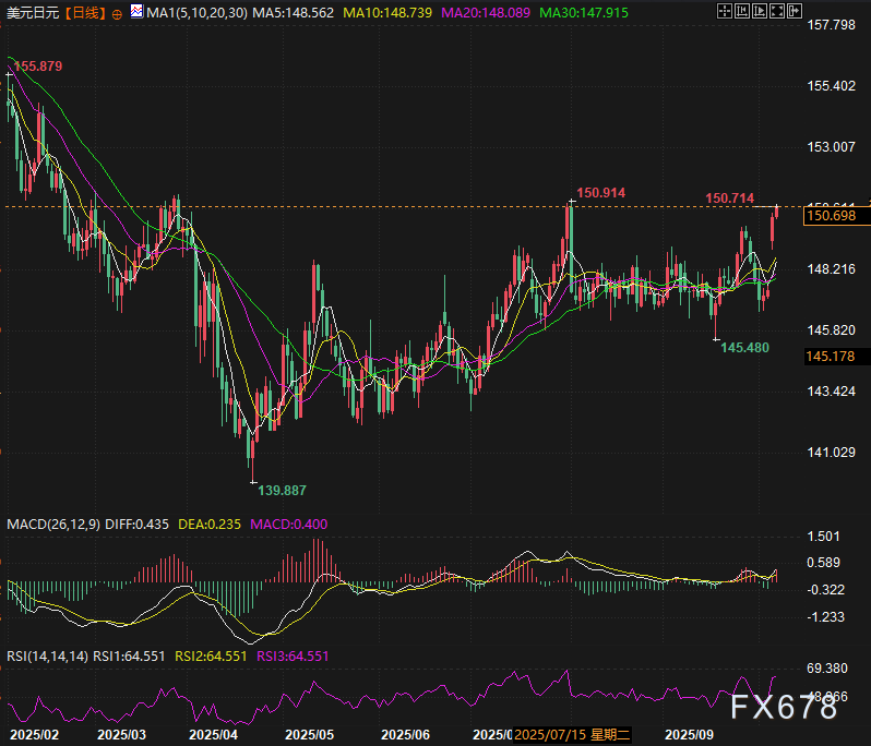 同时,受人工智能领域持续乐观情绪带动,亚洲股市跟进隔夜华尔街涨势,进一步削弱日元的避险属性。不过,今日早间公布的数据显示,日本8月家庭支出增速超预期,为日本央行进一步收紧政策提供了数据支撑,或对日元形成阶段性利好。此外,市场对美联储的鸽派预期,可能限制美元出现实质性升值,进而制约美元兑日元的上行空间。 日本央行加息预期降温,日元空头主导市场 日本总务省本周二早间公布的数据显示,日本家庭支出已连续第四个月同比增长,增幅达2.3%。尽管主张财政宽松的高市早苗在周六的自民党(LDP)领导层选举中胜出,但该数据仍为日本央行维持加息路径提供了支撑。 在此次选举中,高市早苗因是唯一支持大规模财政支出的候选人而凸显差异,预计她将在10月中旬的议会会议上正式就任日本首位女性首相。市场对更激进扩张性经济政策的预期,将使日本央行的政策调控陷入困境,进而持续对日元施加下行压力。 但是值得注意的是,虽然高市早苗去年反对加息,称其“愚蠢”,但近期其表示货币政策细节由央行决定,试图与鸽派立场划清界限。 全球股市继续上涨提振风险偏好压制日元 下周即将开启三季度财报季,在此之前,纳斯达克指数与标准普尔500指数于周一创下收盘历史新高,这或成为吸引投资者入场的新催化因素。此外,受更激进扩张性经济政策预期推动,日本日经225指数触及历史新高,进一步削弱市场对避险货币日元的需求。 美元基本面未改,限制日元贬值幅度 与此同时,美元在前一交易日从9月末震荡高点附近回落调整后,今日重新获得上行动能,这也成为推动美元兑日元升至8月初以来高位的另一关键因素。不过,由于市场对美联储的鸽派预期未改,美元多头信心仍显不足。根据芝商所(CME)美联储观察工具,市场对美联储10月、12月分别降息25个基点的概率,已分别升至约95%和84%。此外,市场担忧美国政府长期停摆可能扰乱经济运行,这一因素同样对美元及美元兑日元构成利空。 事实上,美国联邦政府已于周一进入连续第六天停摆状态,参议院在未就支出法案达成共识的情况下宣布休会。民主党多次否决共和党提出的支出法案,并持续呼吁延续对数百万美国民众的医疗补贴政策。当前,交易员正聚焦本周美联储公开市场委员会(FOMC)核心成员的讲话,其中包括美联储主席杰罗姆·鲍威尔(JeromePowell)周四的公开表态。除此之外,周三公布的FOMC会议纪要,或就美国经济风险加剧背景下的降息路径提供更多线索,而这将直接主导美元及美元兑日元的后续走势。 技术分析: 继上周从30日简单移动平均线(SMA)支撑位反弹后,美元兑日元隔夜突破150.00心理关口,这一走势进一步巩固了该货币对的多头格局。此外,日线图震荡指标维持在积极区间,且尚未进入超买区域,表明现货价格的阻力最小路径仍为上行。因此,美元兑日元存在明确的进一步上涨空间,有望测试8月震荡高点(约151.00附近)。若后续突破该关口,将为短期内进一步升值打开空间。 另一方面,当前回调走势或在150.00关口下方获得较强支撑。若汇率进一步下行,149.40附近区域或成为市场买入节点,这一位置将有效限制美元兑日元向149.00关口附近的下行空间。若汇率明确跌破149.00,现货价格可能进一步下探至下一个关键支撑位148.35附近,随后或测试148.00整数关口及147.80区域。若上述支撑位悉数失守,短期内市场情绪或将转向空头主导。 道富银行东京分行经理Bart Wakabayashi指出,在市场等待高市早苗政府架构进一步明确的过程中,日本官员或会通过“口头干预”,遏制日元近期的极端贬值势头。 谈及高市早苗时,Wakabayashi表示:“我们将观察她所关联的那些预期政策能否落地。从心理层面和经济层面来看,1美元兑150日元都是一个非常重要的关口。” 笔者提示交易者这里可能由于日元大幅贬值,日元出口商扎堆结汇,导致大的回调风险。