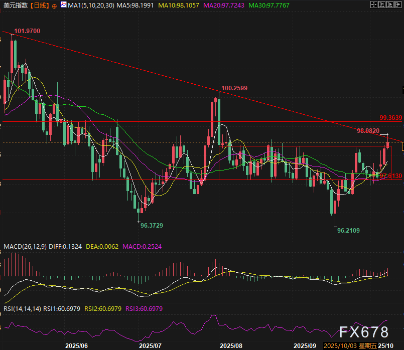 正如市场常言“无消息即好消息”,而停摆导致国内缺乏新增疲软经济数据(尤其是美国就业市场状况相关数据)的发布,这一局面或许也在为美元提供隐性支撑。 恰巧的是,本周美国原本就无一级经济数据排期发布,因此当前的数据延迟对市场实际影响有限。 但下周的情况则截然不同——若9月消费者物价指数(CPI)报告(原定10月15日发布)被迫推迟,美元是否会遭遇抛售压力,这一变量值得重点跟踪。 根据Polymarket的概率模型,目前停摆至少持续至下周三的可能性已达三分之二,因此数据推迟的概率较高。 未来数日,市场仍将迎来多位美联储官员的讲话,其中包括周四晚上美联储主席鲍威尔的公开表态,周四凌晨还将公布联邦公开市场委员会(FOMC)最新会议纪要。 从当前基本面与政策逻辑判断,我们认为美联储并无理由放弃今年再实施两次降息的政策指引。 技术分析: 美元指数突破97.60后出现了一个破底翻形态,之后回踩颈线继续上攻,今天的上涨突破了前期震荡整理的箱体上沿,同时此位置也是破底翻形态的量度涨幅,等于一天突破了两个关键价位。 目前最大压力位在100.00整数关口附近,也是美元指数的牛熊指示线和今年8月1日非农公布的大阴线的50%分位附近,同时也有很强的下降压力线限制美元继续反弹。 目前支撑在98.60附近的箱体上沿,以及下方97.61的破底翻形态颈线,压力位在100.00整数关卡附近以及逐步下移的下降压力线。