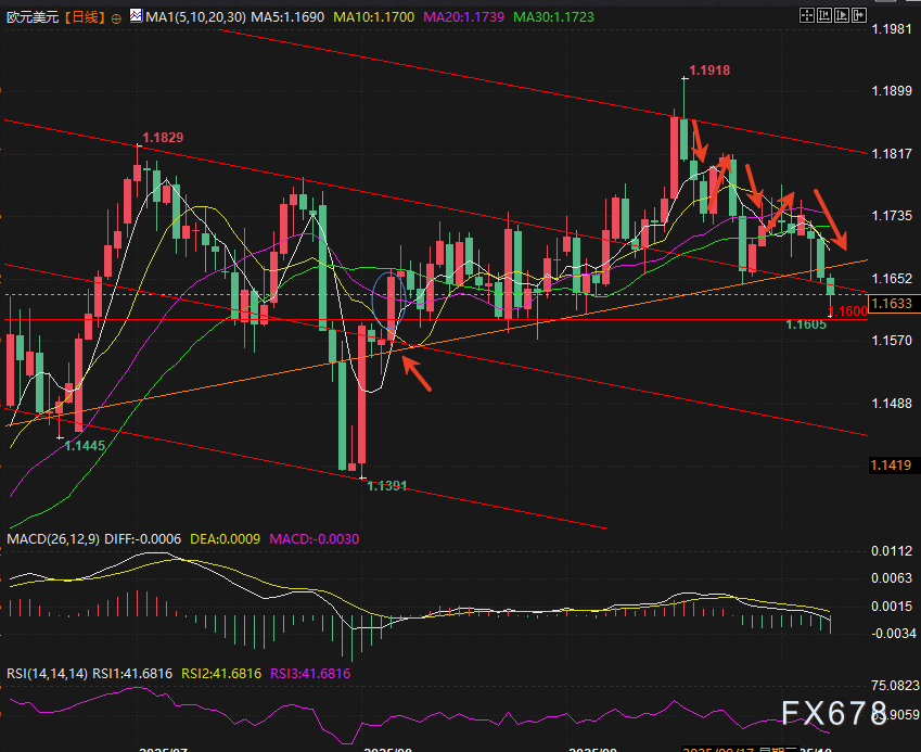 法国政治局势未能提供明确指引 周三早间,法国即将卸任总理塞巴斯蒂安·勒科尔尼表示,其对年底前达成预算协议持乐观预期,这一表态有效缓解了市场对法国提前大选的担忧情绪。 勒科尔尼在与保守派及中右翼政党会晤后向记者透露:“各方均有共识,希望在今年12月31日前敲定法国年度预算方案。”尽管该消息面进展在一定程度上帮助欧元守住当前价位,但截至目前,尚未出现能够支撑欧元开启稳定反弹的明确信号。 欧元区国债收益率走低,法国与德国10年期国债利差收窄至85个基点,市场继续关注法国政治进展 德国数据不尽如人意拖累欧元 德国8月工业产出下降4.3%,远逊于预期下降1%。德国经济部:德国失业率今年预计将升至6.3%,随后在2026年降至6.2%,2027年进一步降至6.0%。将2025年德国经济增长预期从此前的0%上调至0.2%。预计2026年德国GDP将增长1.3%,2027年将增长1.4% 地缘政治扰动压制欧元 欧洲央行行长克里斯蒂娜·拉加德指出,任何动用被冻结俄资产以支持乌克兰的方案,均须严格遵循国际法框架。目前,欧盟委员会提议动用1700亿欧元被冻结的资产,将其投资于由欧盟成员国担保的零息欧盟债券,并将由此产生的资金以赔偿贷款形式提供给乌克兰。 拉加德强调,所有相关操作必须完全符合国际规则,以维护欧元的国际声誉及对投资者的吸引力;此外,该决策还需获得所有持有俄罗斯资产的相关方一致同意。 奥地利政府对欧盟委员会的上述提议表示支持,但目前仍在等待具体法律文本以开展合规审查。 欧盟委员会认为,已找到兼顾“避免资产没收”与“支持乌克兰”的可行方案。为向乌克兰提供赔偿贷款,欧盟委员会正考虑调整相关的制裁机制——当前制裁措施每六个月更新一次,这一周期或难以保障贷款的长期稳定性。同时,欧盟方面也在探讨是否有可能突破“全体一致同意”的决策原则,以推动方案落地。 同时近期无人机事件在欧洲持续发酵,丹麦、德国称在各自国家发现无人机。10月2日比利时军事基地上空不明无人机事件就此事欧盟委员会主席冯德莱恩表态:目前,比利时国防部正在就此事件展开调查。无人机事件是当前各类威胁持续升级过程中,一个令人担忧的趋势性信号。无人机事件及领空侵犯行为,本质是旨在分裂欧盟、削弱对乌克兰支持的系统性行动。 欧洲正面临“混合冲突”的直接挑战。我们必须明确追究相关行为责任,绝不能回避这一核心问题 美国方面: 周二,美元指数呈现全面走强态势,尽管美国拨款法案投票再度失败,但市场对此消息予以忽视,最终推动欧元兑美元汇率进一步下行。 美国参议院多数党领袖约翰·图恩明确表示,将反复提交同一版拨款法案,这一立场预示短期内达成预算协议的可能性极低。与此同时,据报道,美国白宫行政管理和预算局已发布备忘录,明确指出75万名被迫休假的联邦工作人员无法获得补发工资的保障。 尽管美国政府停摆引发的不确定性对美元的负面影响正逐步消退,但需注意的是,若停摆局面持续时间过长,导致关键经济数据发布不断推迟,投资者或会对进一步押注美元上涨持谨慎态度,进而抑制美元升势。 技术分析: 欧元兑美元近两日跌破下降通道中轨,同时跌破上升趋势线,空头得到了宣泄,汇价在1.1600上方受到8月6日破底翻颈线支撑后反弹,同时汇价自9月17日高点的1.1918起完成了简单的五浪下跌,欧元有望依托1.1600颈线开启震荡反弹。但整体下跌格局仍然未改变,反弹的压力位位于图中橘黄色上升趋势线。