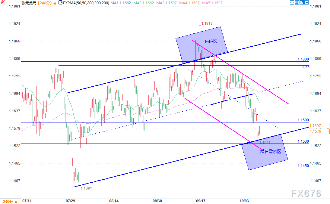 (欧元/美元4小时) 近几个月欧元兑美元的汇率波动形成了一个上升通道,汇率已跌破支撑线S,在跌破1.16600后,欧元兑美元的下行趋势仍在延续。 9月中旬,汇率进入了一个供给区。该供给区位于此前接近1.1790的高点与1.1800这一心理关口之上。正如“流动性扫盘”(Liquidity Sweep)形态所显示的那样,聪明资金(smart money)当时似乎在建立空头头寸。 自那以后,市场一直在向相反方向寻求流动性。在欧元兑美元走势图上,我们已在关键点位附近识别出一个潜在需求区,具体包括:蓝色上升通道的下轨;1.1530点位,该位置可能存在多头止损单;1.14500支撑位。 从空头视角来看,当前市场正处于一个下降通道内;该通道的中位线与此前1.1600的局部支撑位,均可能构成阻力。 基于上述分析,短期来看,市场仍维持空头趋势;中期而言,空头压力或有所缓解,欧元兑美元可能进入盘整阶段。 这一走势能否实现、具体将以何种形态呈现,在很大程度上取决于美国与法国两国的新闻动态及政治局势发展。