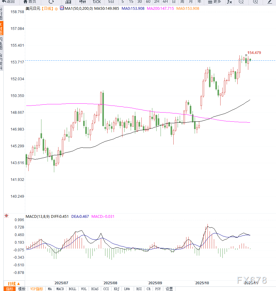 同时,日本副财务大臣兼外汇主管 Mimura 指出近期日元走势偏离基本面,市场对日本宏观政策,尤其是财政政策存在较多猜测,日元多头态度谨慎,缺乏进取性的仓位布局。 美元方面,受强劲美国宏观数据支撑,短线美元略显强势。10月ADP 私营部门就业新增 42,000 个岗位,高于市场预期的 25,000;ISM 非制造业 PMI 达到八个月高点。 然而,美国政府关门持续至今已达 36 天,官方数据缺失增加经济不确定性,限制美元多头加仓的意愿。 日线图显示,USD/JPY 近期处于 153.65–154.45 的横盘整理区间,价格多次试探上方阻力未果。短期均线 20 日和 50 日均线接近交汇,显示市场短线多空均衡。 RSI 指标在 50 附近震荡,尚未形成明确趋势信号。若价格突破 154.50并站稳,短线有望向 155.60–156.00 挑战;若失守 153.00,下行空间可能打开至 152.55–151.55 区间。 整体来看,日线结构呈现震荡偏多格局,但仍受宏观事件和政策不确定性驱动。