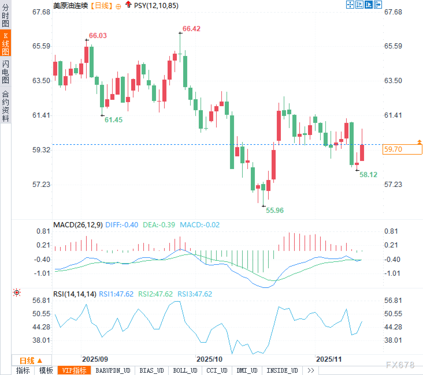 基本面 地缘事件成为本轮反弹的直接催化剂。乌克兰无人机对俄罗斯黑海港口Novorossiysk石油设施实施的打击,引发市场对供应中断的担忧。该港口作为俄罗斯关键的原油出口枢纽之一,其转运设施及多处沿海基础设施遭到袭击碎片波及,区域当局确认了这一消息后,市场立即做出供应风险定价反应。 更深层的供应忧虑源于即将生效的制裁政策。美国针对俄罗斯原油流动的新一轮制裁措施将于11月21日正式启动,这给市场带来了实质性的不确定性。俄罗斯最大的私营石油生产商Lukoil已经开始在全球交易部门实施人员精简,这一战略性收缩动作表明,市场参与者正在为即将面临的运营灵活性下降做出防御性调整。市场分析人士警告,俄罗斯海运原油出口中的相当一部分可能面临被搁置的风险。 国际能源机构发布的最新预测显示,2025年全球原油市场将面临超过240万桶/日的供应过剩,这一数字在2026年将进一步扩大至超过400万桶/日,即便全球需求继续保持增长态势。这一预测与OPEC+的评估高度一致,后者自今年4月以来便开始逐步增产,并预计明年市场将出现又一轮温和供应过剩。 美国能源信息署公布的数据进一步强化了供应过剩的叙事。本周美国原油库存增幅远超市场预期,这在已经供应充裕的市场环境中敲响了警钟。库存累积发生在美国原油产量逼近历史纪录的关键时刻,这种结构性的供应压力对油价形成持续的向下拉力。 在这样的宏观格局下,油价的反弹主要依赖地缘政治风险溢价的支撑,但这种支撑受到基本面供需失衡的制约。交易员正密切关注美国制裁措施的具体执行情况、俄罗斯供应流向的变化,以及国际能源机构和OPEC+即将发布的月度报告,这些因素将决定近期油价反弹能否持续。 技术面 从日线图的整体结构来看,美原油自66.42美元的阶段性高点展开了一轮幅度可观的下降趋势。价格行为清晰地勾勒出空头主导的市场格局,连续的阴线实体配合持续走低的高点和低点,构建了典型的下降通道形态。这一波段性回调在触及55.96美元的低点后暂时企稳,随后展开了一轮修复性反弹,目前交投于60美元附近。