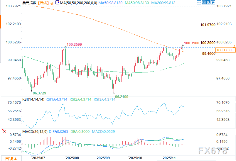 延迟发布的9月零售销售数据和生产者物价指数(PPI)将于周二公布,这些数据有望在美联储今年最后一次会议前重塑市场预期。目前交易员认为12月美联储降息25个基点的概率已超70%,若数据进一步走弱,市场可能会强化降息预期,进而给美元带来更多抛售压力。 交叉货币波动加剧假期周美元弱势 交叉货币资金流动限制了美元指数向100.182上方突破。日元兑美元报157.161,市场持续关注日本政府的干预风险——日本当局的口头警告虽减缓了日元贬值速度,但未能扭转趋势;若出现实际干预,美元兑日元可能短暂回落,但未必会改变美元整体资金流向。 欧元兑美元升至1.1552,此前纽约联储主席约翰·威廉姆斯的言论暗示存在降息空间;英镑兑美元持稳于1.3118,等待英国财政预算公布;新西兰元兑美元徘徊在0.5603,交易员为新西兰联储(RBNZ)预期中的降息做准备;澳大利亚元兑美元报0.6454,静待消费者物价指数(CPI)数据发布。这些交叉货币的波动共同压低了美元的整体走势。 收益率回调与风险偏好低迷抑制美元买盘 长端国债收益率下行叠加市场流动性稀薄,制约了美元构建上行动能的能力。由于投资者不愿在长周末前增加风险敞口,美元未能获得通常由强劲收益率或向好数据提供的支撑。 美元测试关键长期点位技术面区间收窄