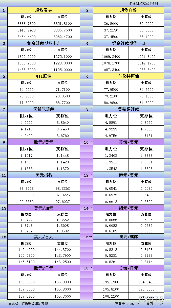 XM官网官网一张图看商品支撑阻力:金银油气+铂钯铜农产品期货(2025年6月19